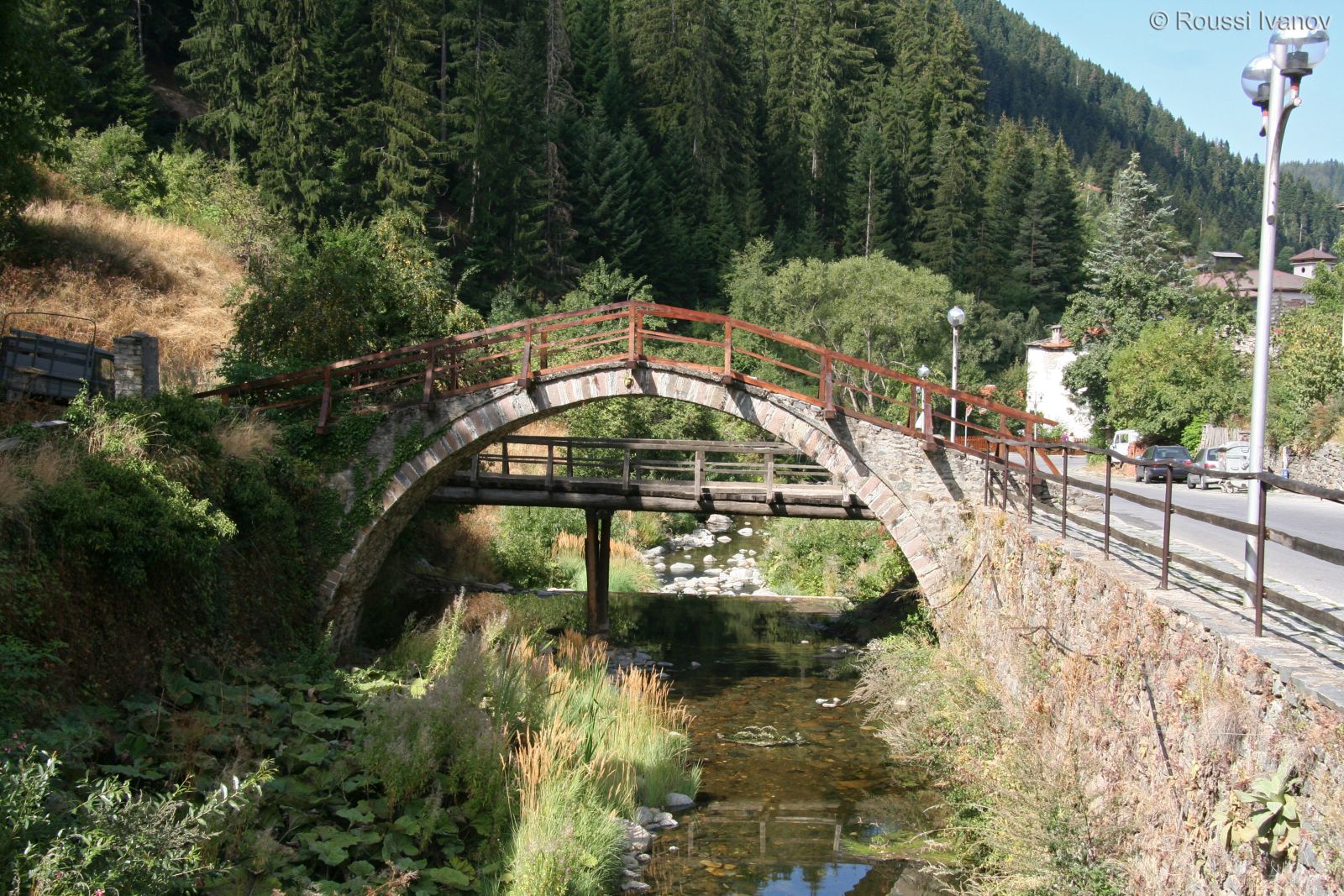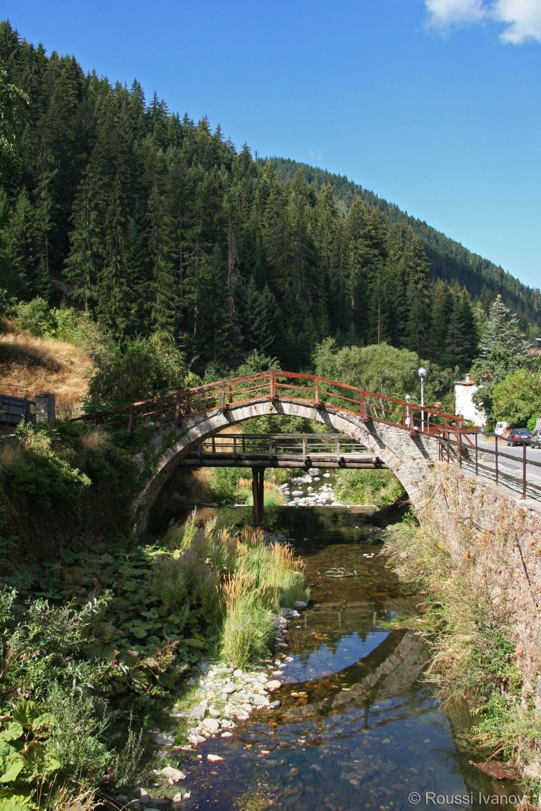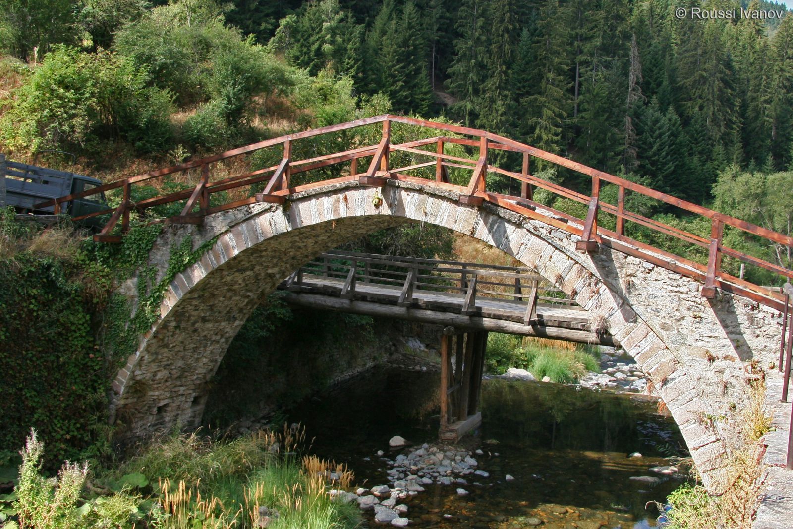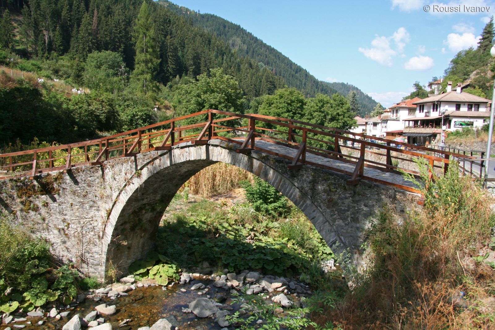 (Old stone arch bridge over Shoroka Laka river, Shiroka Laka, Bulgaria)