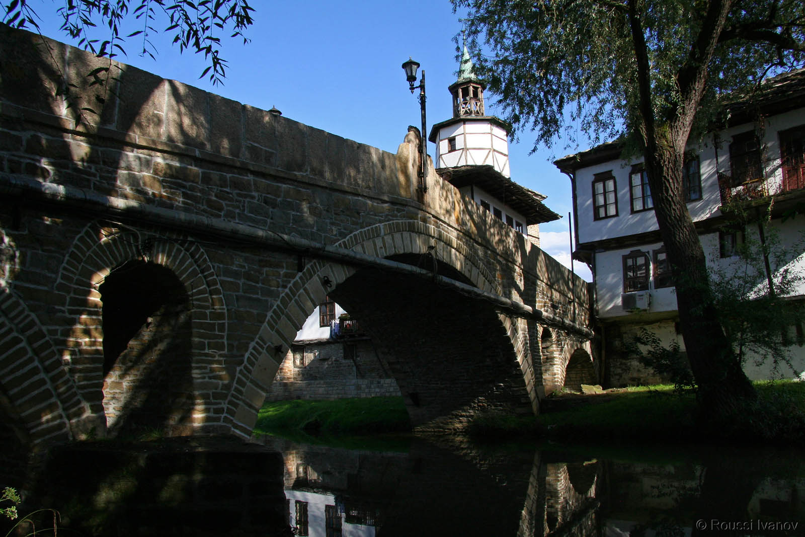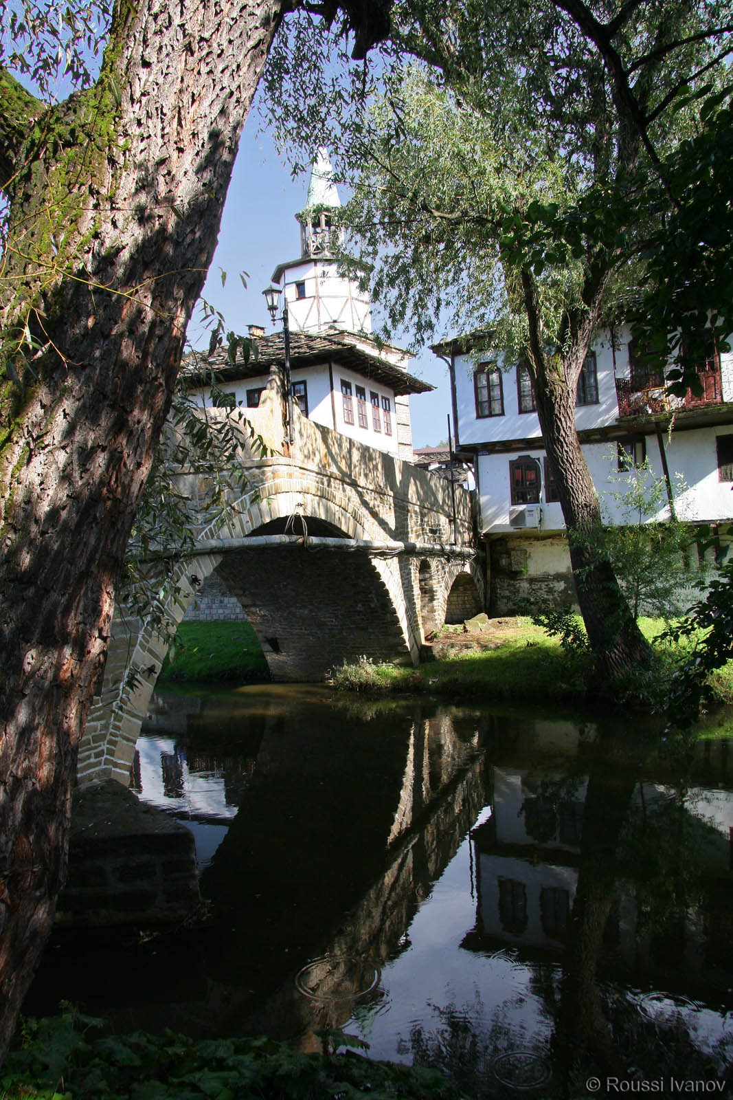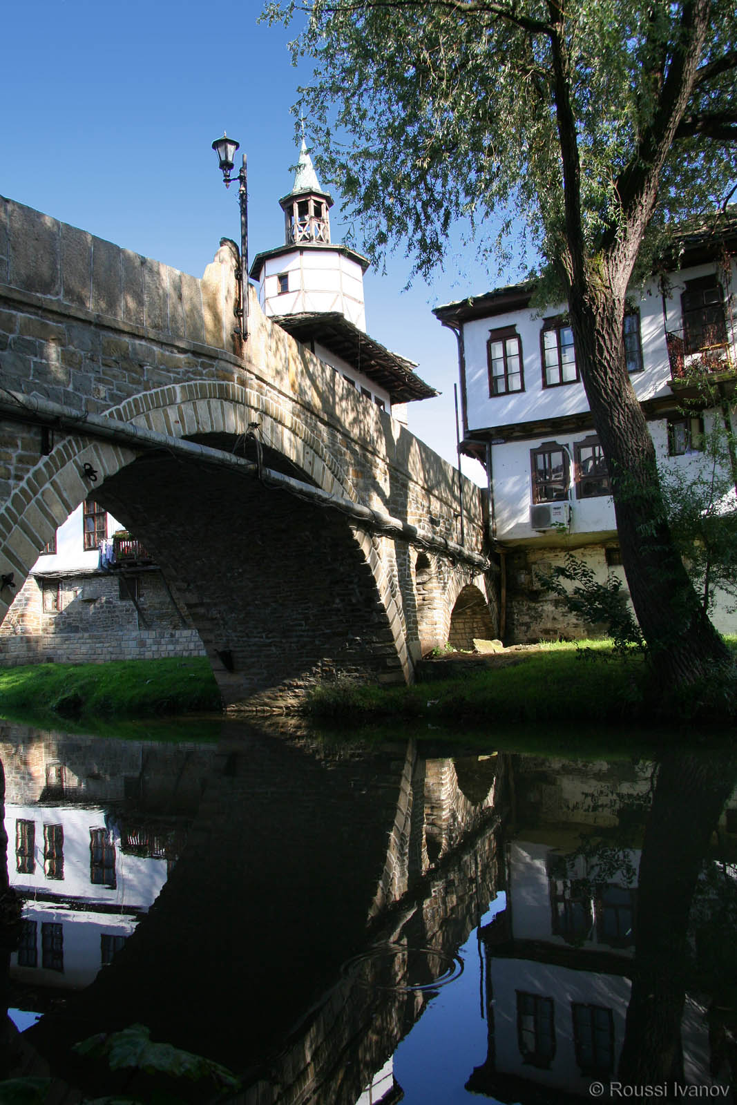 (Tryavna - reflections of the Clock Tower and the Old ("Humped") Bridge on the Tryavna river)