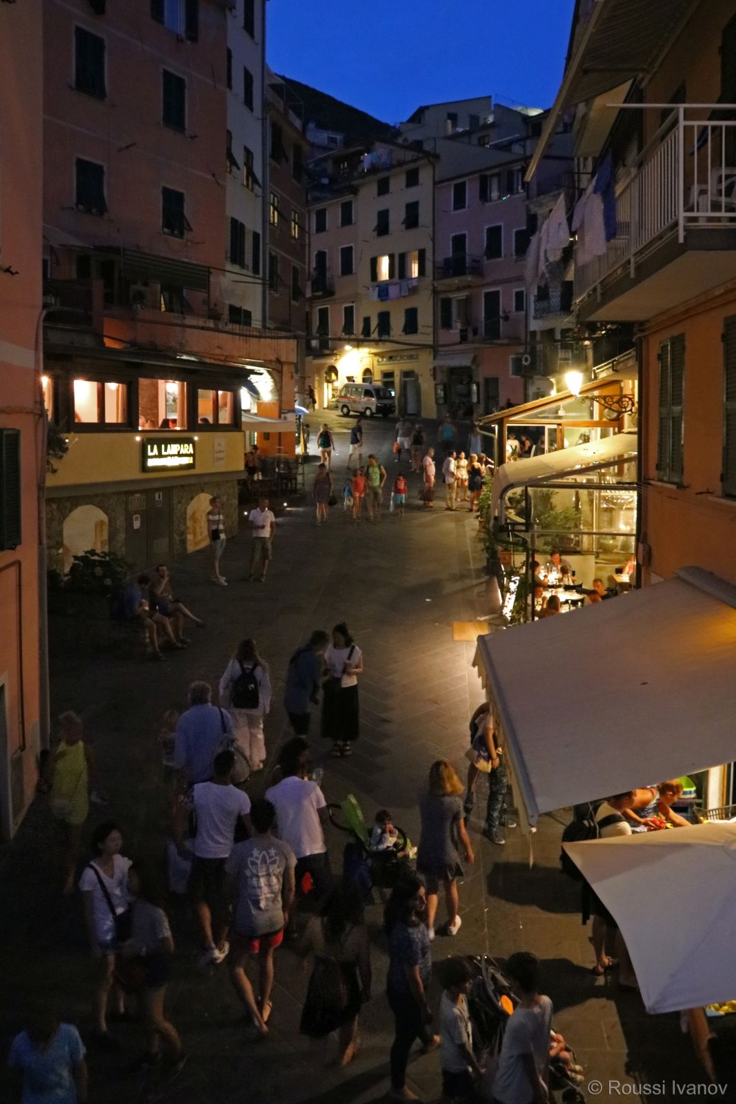 Пиаца Виняйоли през нощта, Риомаджоре, Лигурия, Италия