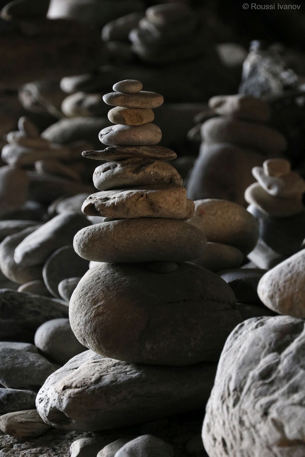 (Our contribution to the stone pyramids in the tunnel to Vernazza's beach, Cinque Terre, Liguria, Italy)