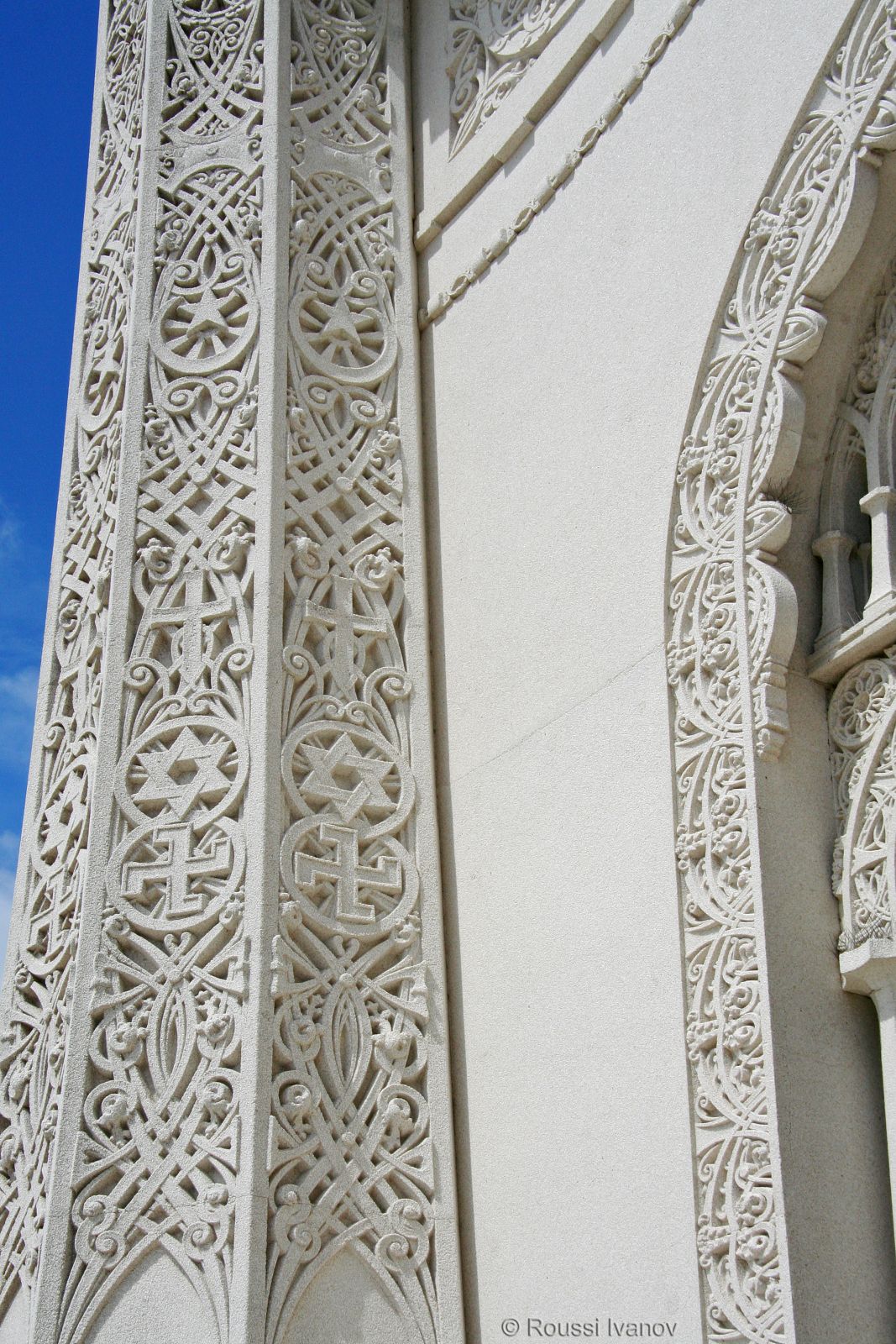 (Symbols of many religions on a pillar of the Baháʼí House of Worship in Wilmette, IL)