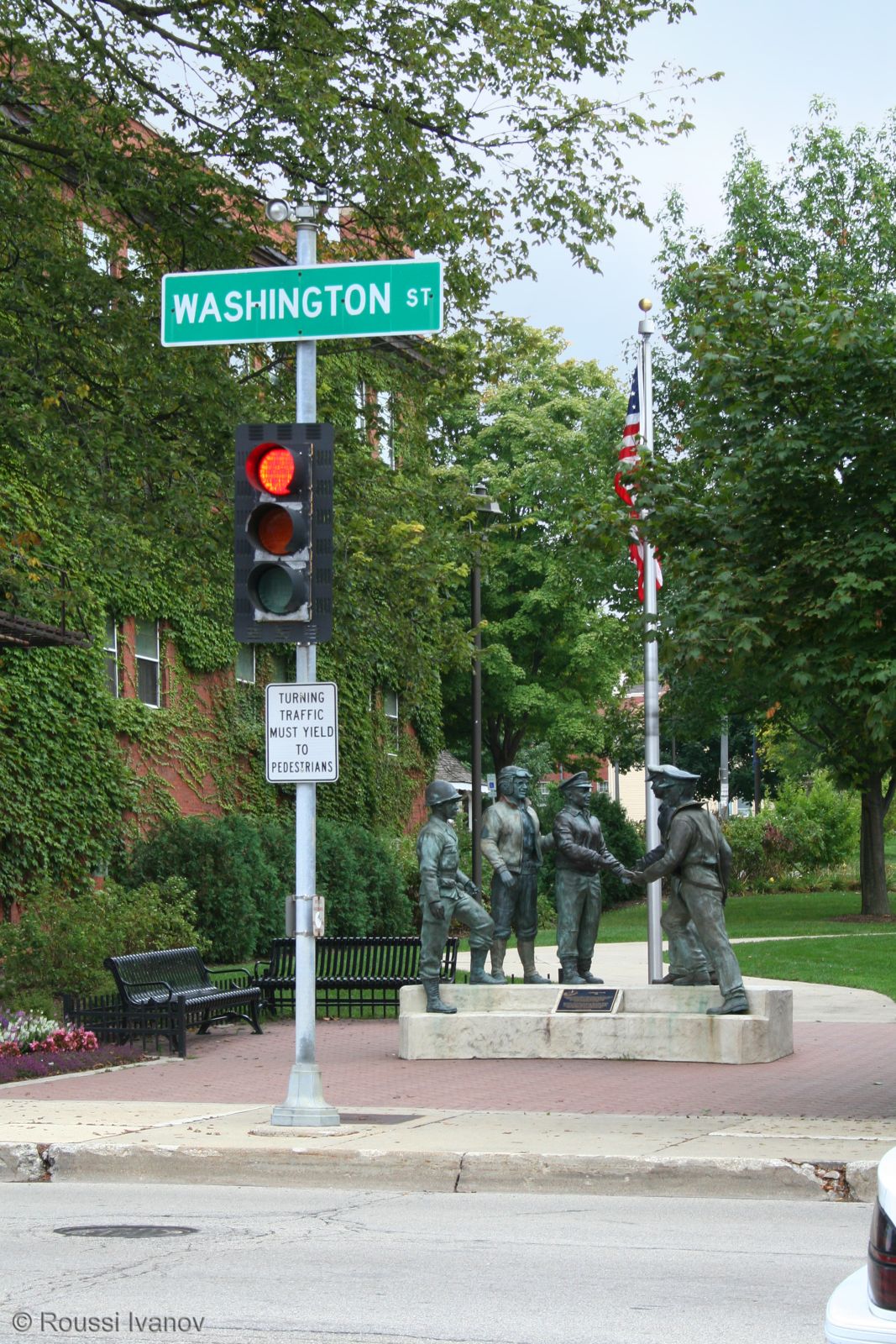 Входът към крайречния парк на Нейпървил, Илинойс (Naperville Riverwalk park entrance, IL)